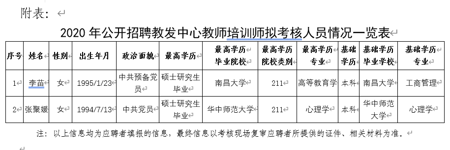 根据学校人事招聘工作有关要求,经人事处资格初审、部门复审,应聘人员基本条件符合招聘要求,经报人事处同意,可以组织应聘人员面试考核。现将拟考核人员情况予以公示(详见附表)。公示期间,如有异议,请向人事处、教师教学发展中心反映。